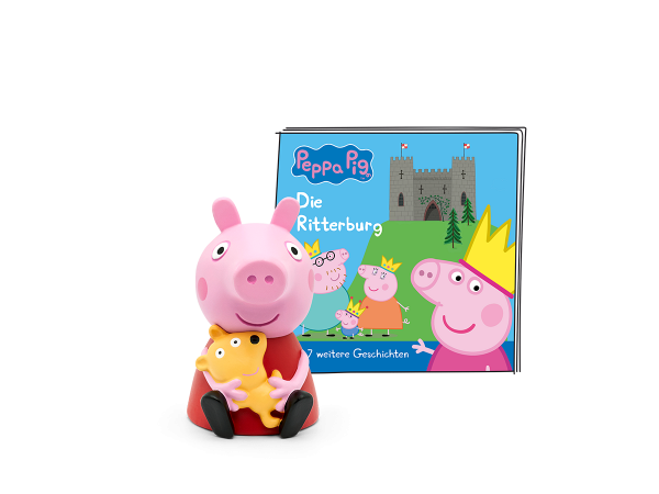 Tonies Hörfigur Peppa Pig Die Ritterburg mit 8 kleinkindgerechten kurzen Geschichten. Die Ritterburg: Schorsch ist schon ganz aufgeregt, denn heute geht es mit der ganzen Familie in eine echte Ritterburg. Ob es auch einen richtigen Drachen zu sehen gibt? Der Fallschirmsprung: Um Geld für die Reparatur des kaputten Schuldachs zu sammeln, veranstaltet Madame Gazelle eine Spendenaktion: Mama Wutz soll dazu Fallschirm springen. Gerald Giraffe ist schon groß: Gerald Giraffe ist neu in der Spielgruppe. Er möchte sich mit Peppa und den anderen anfreunden, und sie wollen zusammen Verstecken spielen. Aber das ist nicht so einfach, weil Gerald Giraffe so groß ist! Frau Mümmels Taxi: Weil Peppa und ihre Familie so viel eingekauft haben, bringt Frau Mümmel sie mit ihrem Taxi zum Haus von Oma und Opa Wutz. Aber das wird heute nicht ihre einzige Taxifahrt bleiben. So tun als ob: Peppas Fahrrad hat einen Platten und muss repariert werden. Aber das macht nichts. Peppa und ihre Freunde haben genauso viel Spaß daran, auf ihren ausgedachten Fahrrädern zu fahren und in ausgedachte Matschpfützen zu springen. Roller fahren: Papa Wutz fährt Schorsch mit seinem Roller zur Spielgruppe. Rollerfahren macht Spaß! Davon kann Papa Wutz auch Mama Wutz überzeugen, und die beiden fahren zusammen mit ihren Rollern los, um die Kinder von der Spielgruppe wieder abzuholen. Die Musikstunde: Madame Gazelle spielt Peppa und ihren Freunden in der Spielgruppe unterschiedliche Musik- Stilrichtungen vor. Die Kinder haben Spaß und tanzen zu den verschiedenen Musiken. Die Puppenklinik: Nachdem Teddy den Hügel hinuntergerollt und in einer matschigen Pfütze gelandet ist, bringt Peppa ihn in die Puppenklink von • Empfohlen ab 3 Jahren • Spieldauer: ca. 44 Minuten